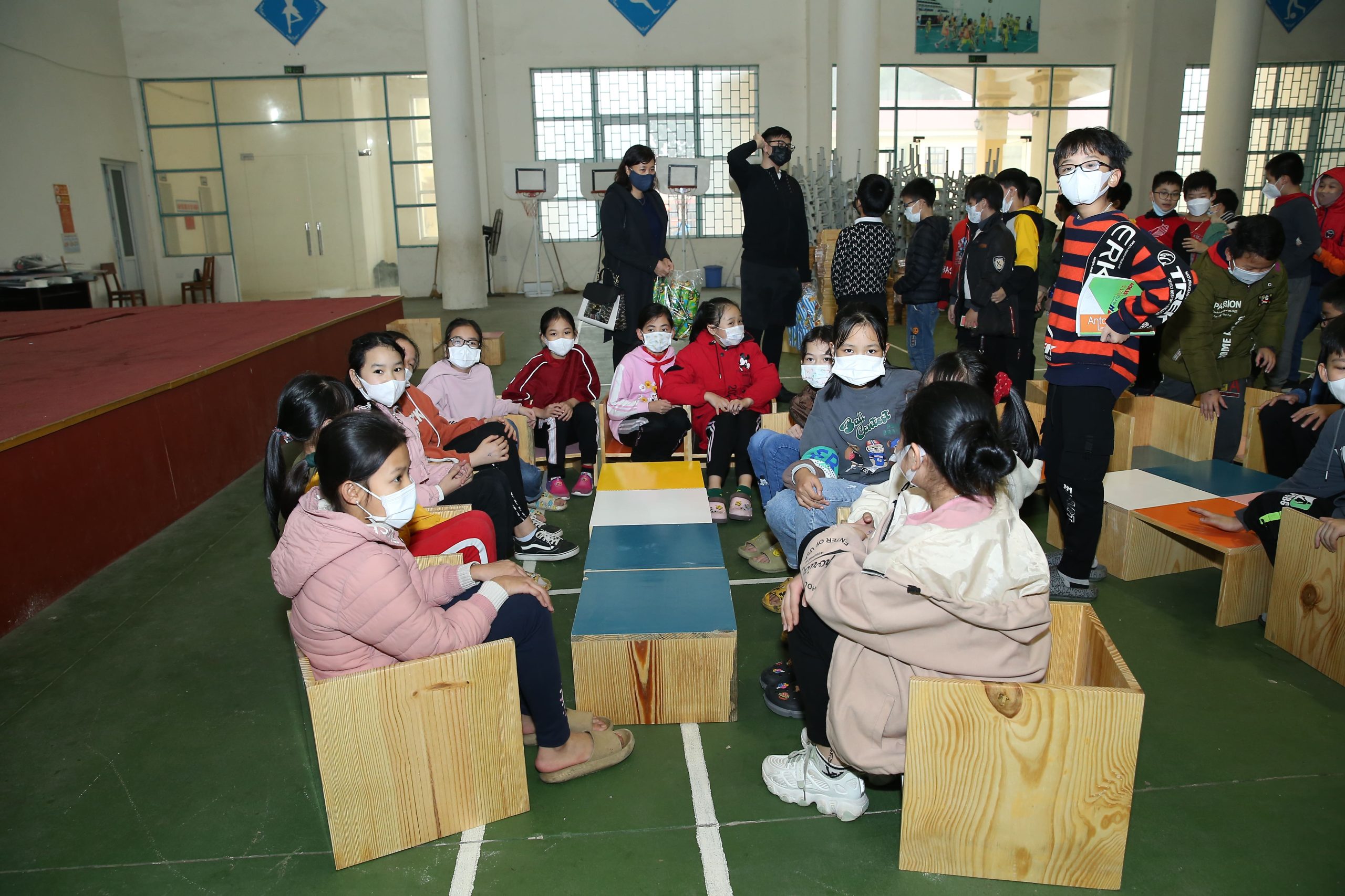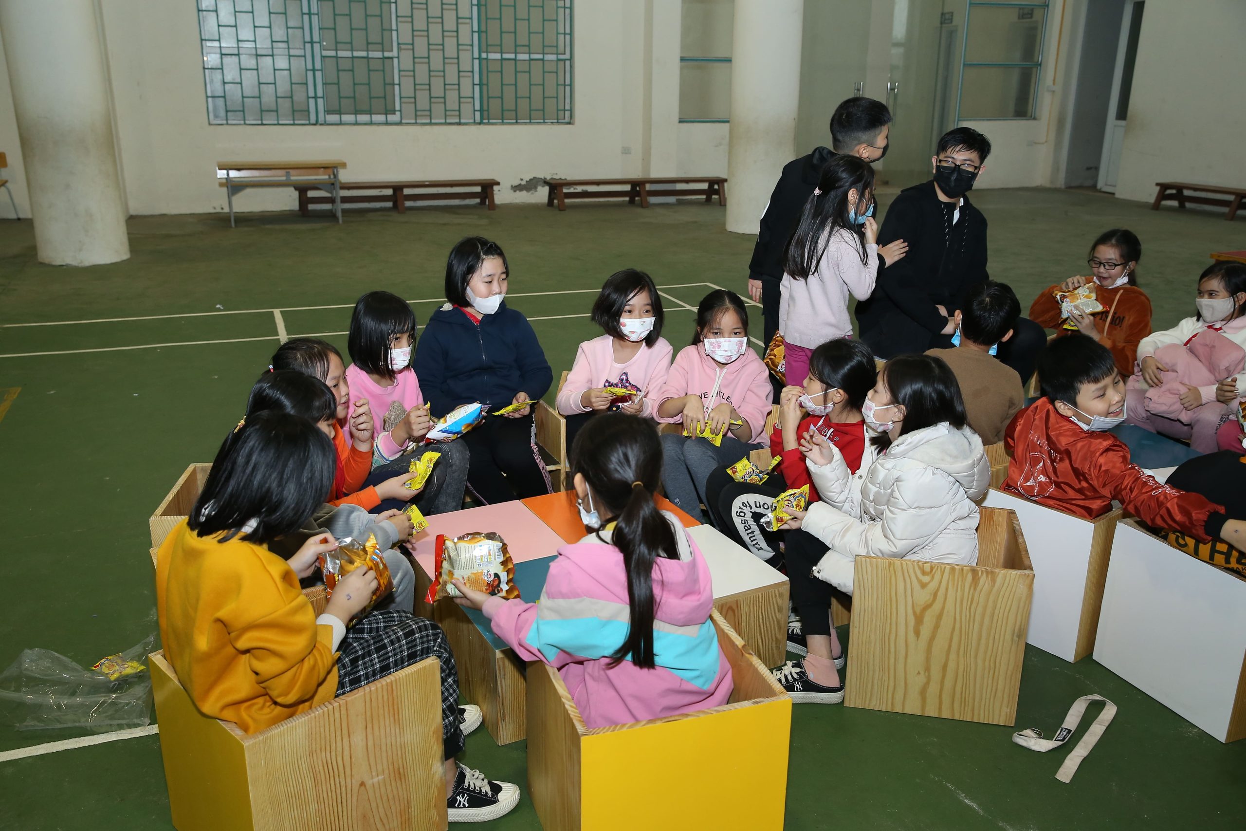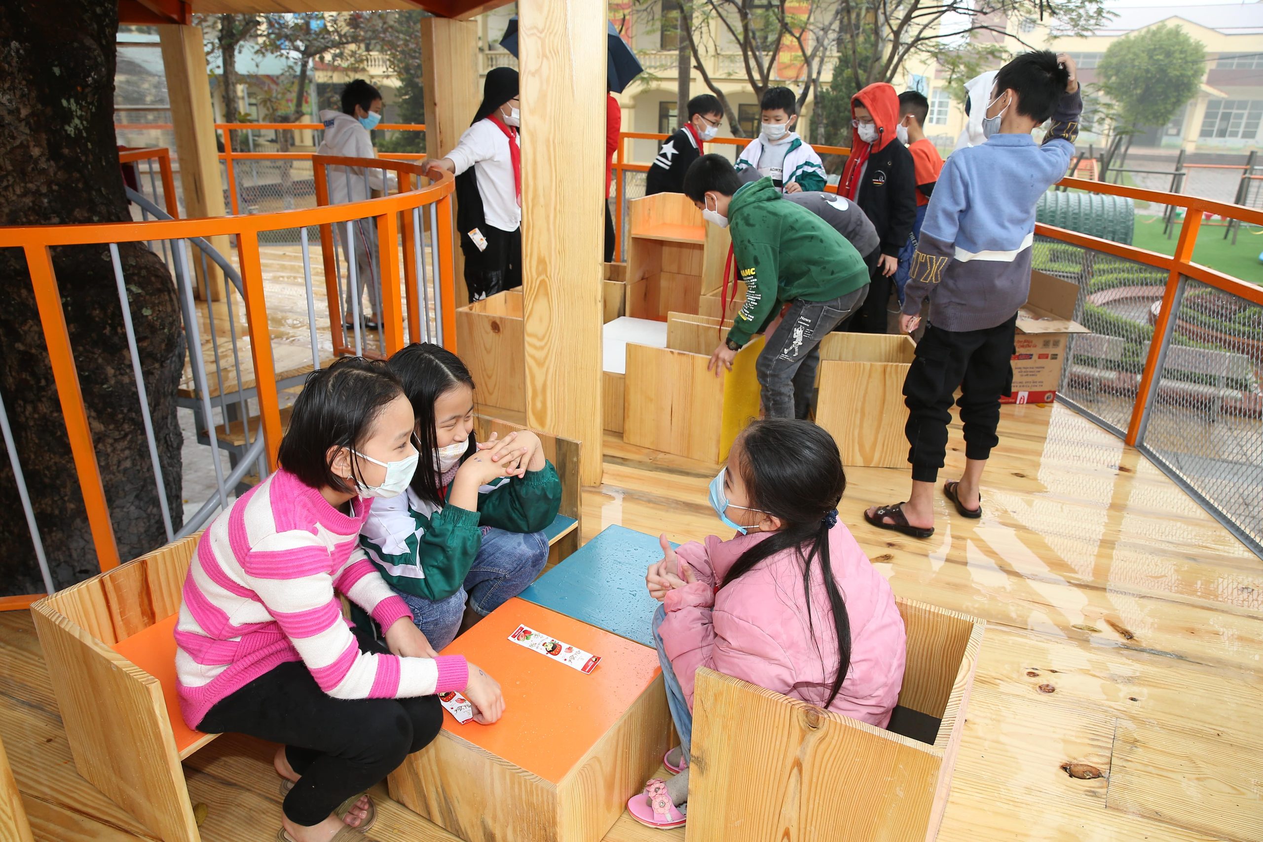 On the first day, the tree towers were opened, the students were extremely interested and some of them even climbed up to the tree towers without being told to do that. As the representative of the project, I had to organise the kids so the inauguration could be started. We started with some fun activities such as answering questions from fairy tales, building creative designs with chairs, and playing musical chairs. All the winners would receive a prize like candies and snacks, which highly motivated the children. Not only the children were more motivated to read more books, they also were able to develop their creative mindset as well as their teamwork capability.